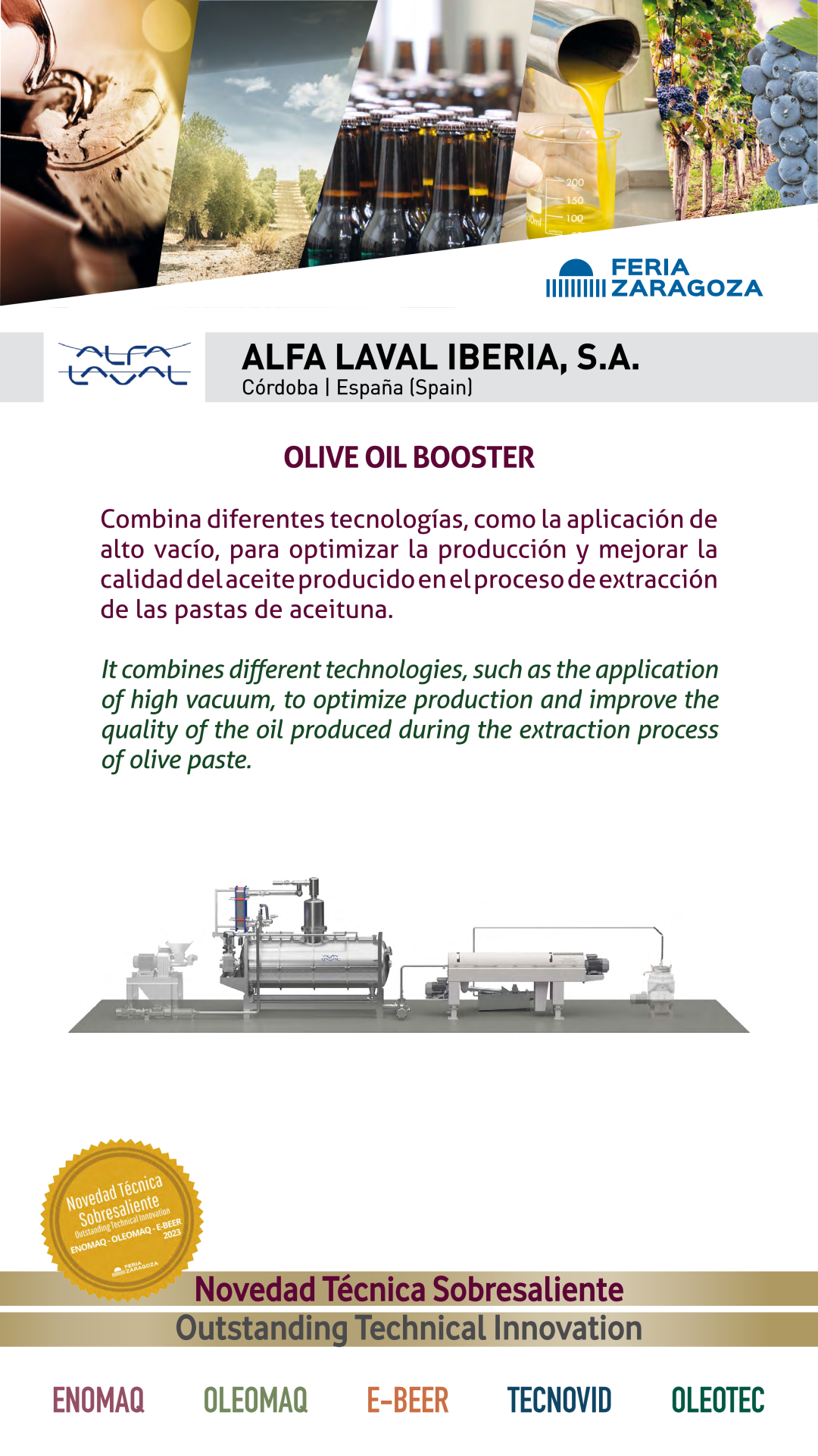 |  ALFA LAVAL IBERIA, S.A. |  ESPAÑA | OLIVE OIL BOOSTERIt combines different technologies, such as the application of high vacuum, to optimize production and improve the quality of the oil produced during the extraction process of olive paste. |