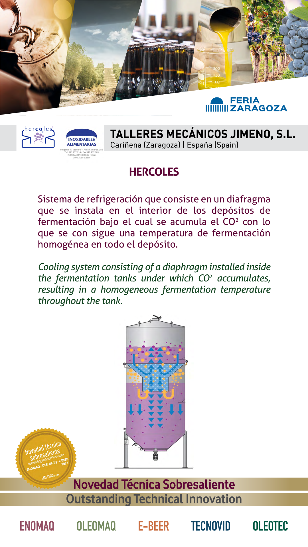 | Premio | Business | Procedencia | Product |  |  TALLERES MECANICOS JIMENO, S.L. |  ESPAÑA | HERCOLESCooling system consisting of a diaphragm installed inside the fermentation tanks under which CO2 accumulates, resulting in a homogeneous fermentation temperature throughout the tank. |