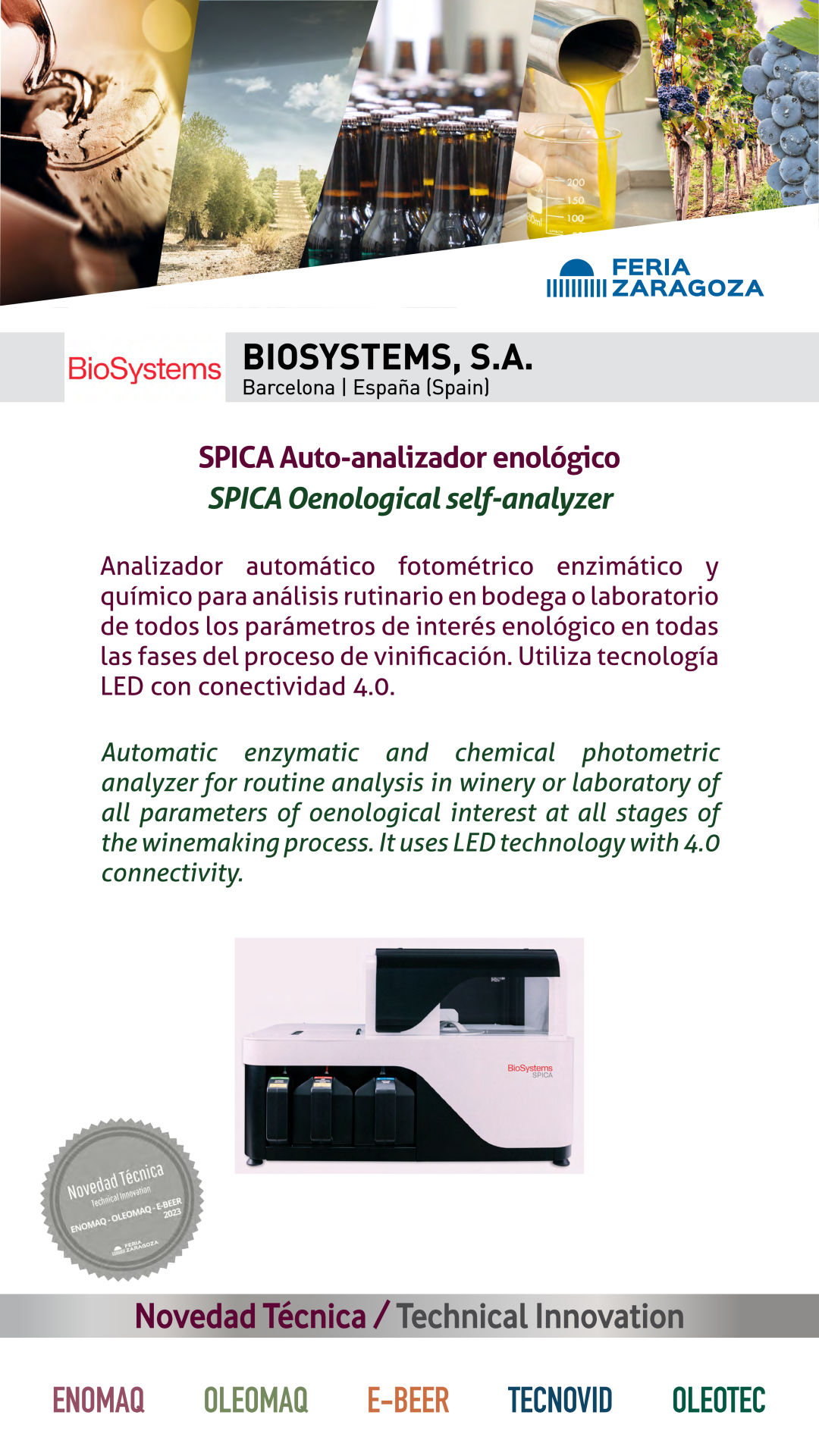 |  BIOSYSTEMS, S.A. |  ESPAÑA | SPICA Oenological self-analyzer Automatic enzymatic and chemical photometric analyzer for routine analysis in winery or laboratory of all parameters of oenological interest at all stages of the winemaking process. It uses LED technology with 4.0 connectivity. |