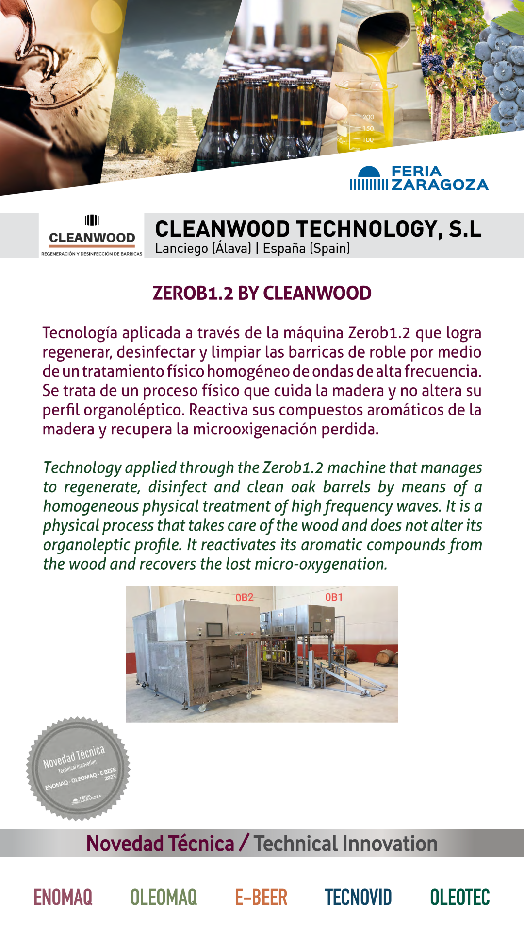 |  CLEANWOOD TECHNOLOGY, S.L. |  ESPAÑA | ZEROB1.2 BY CLEANWOODTechnology applied through the Zerob1.2 machine that manages to regenerate, disinfect and clean oak barrels by means of a homogeneous physical treatment of high frequency waves. It is a physical process that takes care of the wood and does not alter its organoleptic profile. It reactivates its aromatic compounds from the wood and recovers the lost micro-oxygenation. |