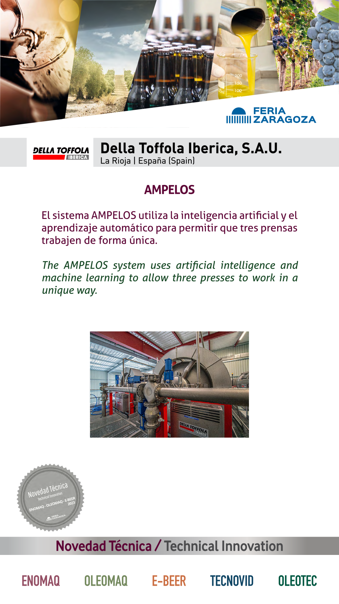 | Premio | Business | Procedencia | Product |  |  DELLA TOFFOLA |  ESPAÑA | AMPELOSThe AMPELOS system uses artificial intelligence and machine learning to allow three presses to work in a unique way. |