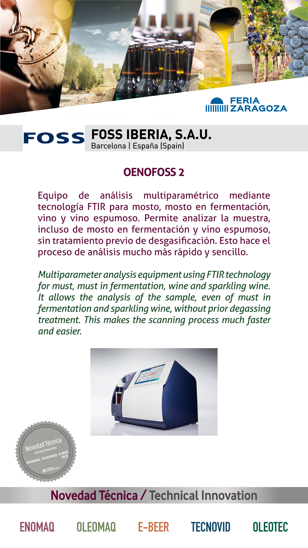 |  FOSS IBERIA, S.A.U. |  ESPAÑA | OENOFOSS 2Multiparameter analysis equipment using FTIR technology for must, must in fermentation, wine and sparkling wine. It allows the analysis of the sample, even of must in fermentation and sparkling wine, without prior degassing treatment. This makes the scanning process much faster and easier. |