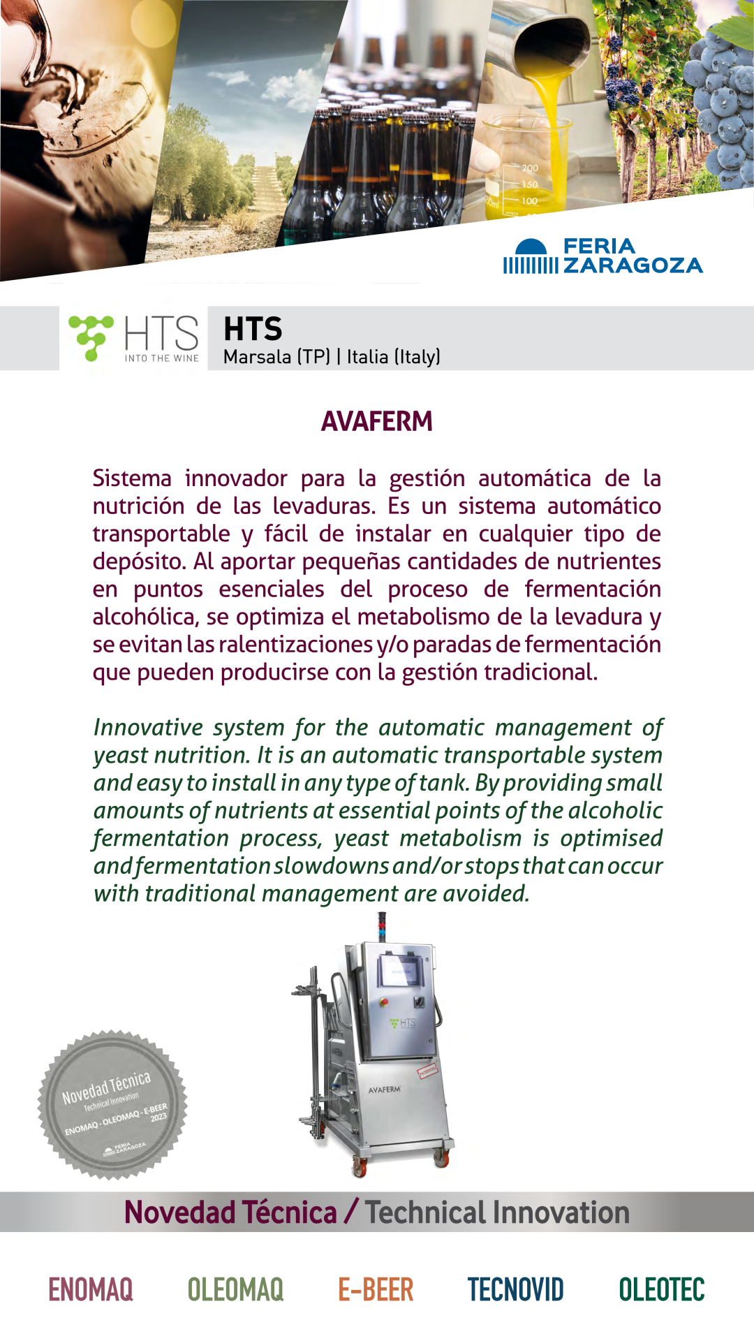 |  HTS |  ITALIA | AVAFERMInnovative system for the automatic management of yeast nutrition. It is an automatic transportable system and easy to install in any type of tank. By providing small amounts of nutrients at essential points of the alcoholic fermentation process, yeast metabolism is optimised and fermentation slowdowns and/or stops that can occur with traditional management are avoided. |