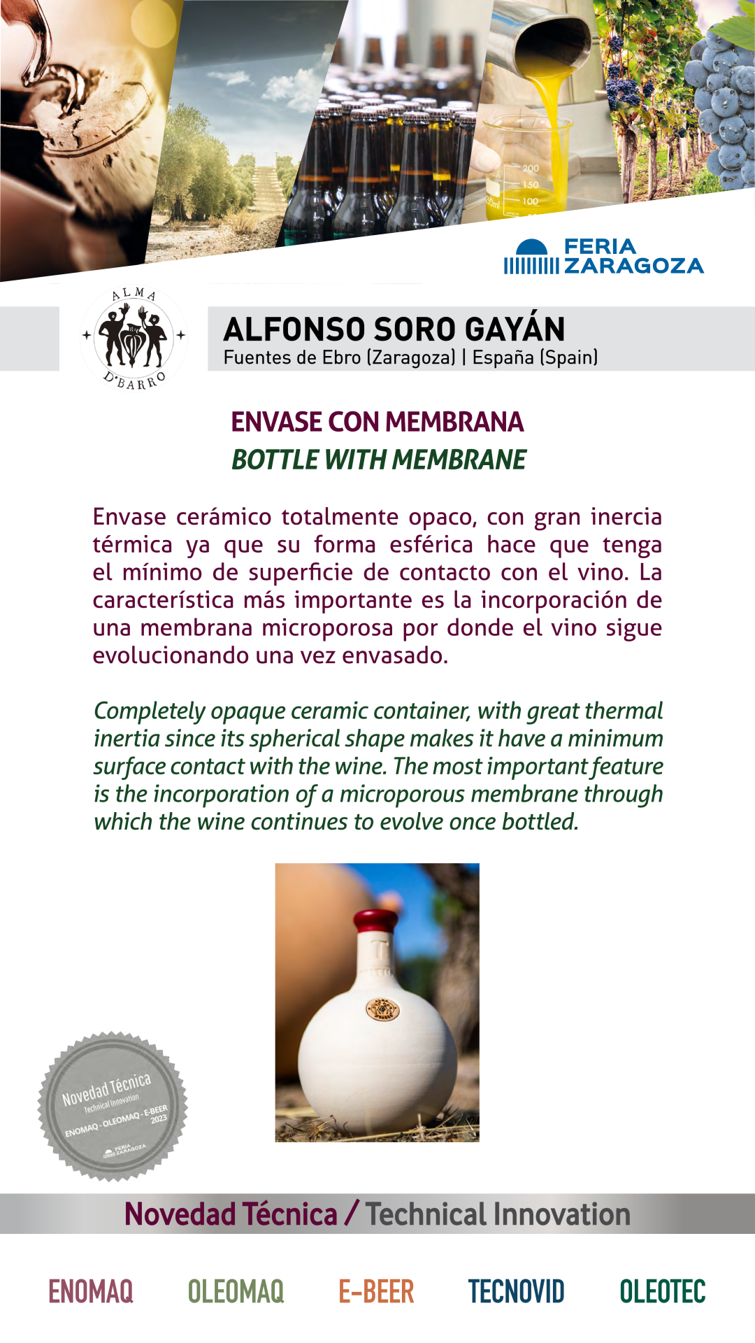|  ALMA D' BARRO |  ESPAÑA | BOTTLE WITH MEMBRANECompletely opaque ceramic container, with great thermal inertia since its spherical shape makes it have a minimum surface contact with the wine. The most important feature is the incorporation of a microporous membrane through which the wine continues to evolve once bottled. |