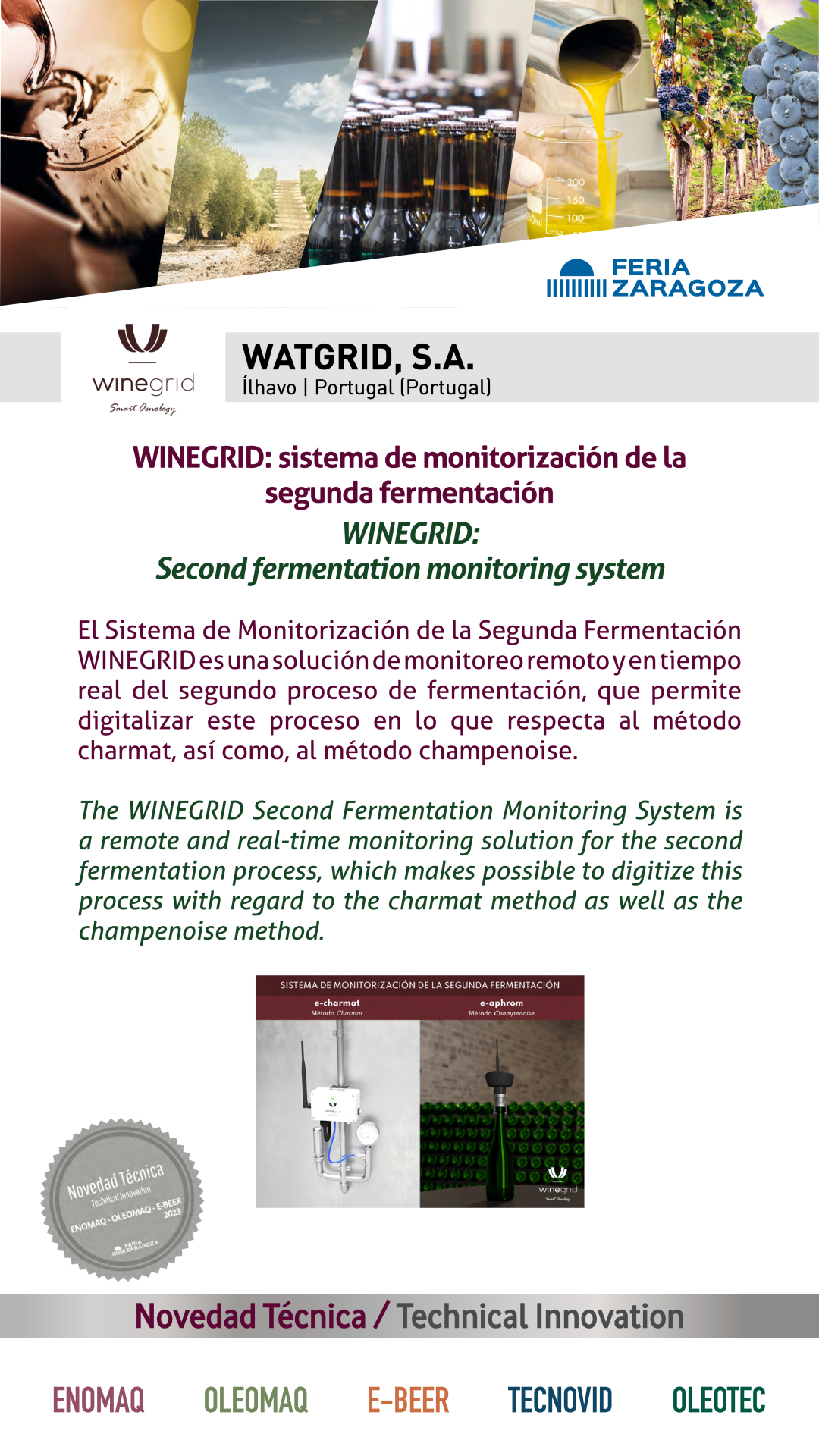 |  WATGRID, S.A. |  PORTUGAL | WINEGRID: Second fermentation monitoring systemThe WINEGRID Second Fermentation Monitoring System is a remote and real-time monitoring solution for the second fermentation process, which makes possible to digitize this process with regard to the charmat method as well as the champenoise method. |