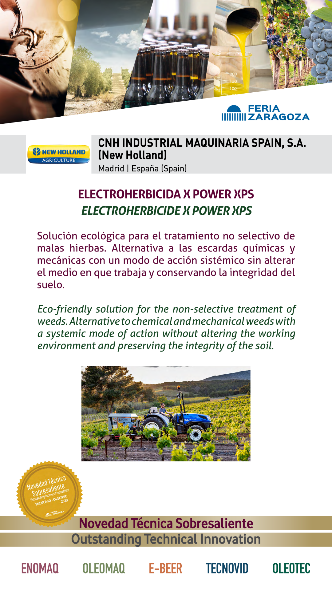 | Premio | Business | Procedencia | Product |  |  NEW HOLLAND |  ESPAÑA | ELECTROHERBICIDE X POWER XPSEco-friendly solution for the non-selective treatment of weeds. Alternative to chemical and mechanical weeds with a systemic mode of action without altering the working environment and preserving the integrity of the soil. |
