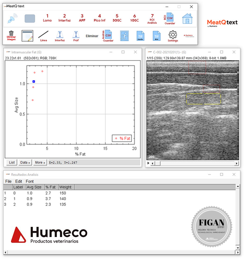 |  CONSORCIO MERCANTIL DE HUESCA, S.L. -HUMECO- |  SPAIN | MEATQ-TEXTSoftware that determines by ultrasound percentage of infiltrated intramuscular fat, live in cattle and pigs. Improves the accuracy, accuracy and predictability of current measurements. |